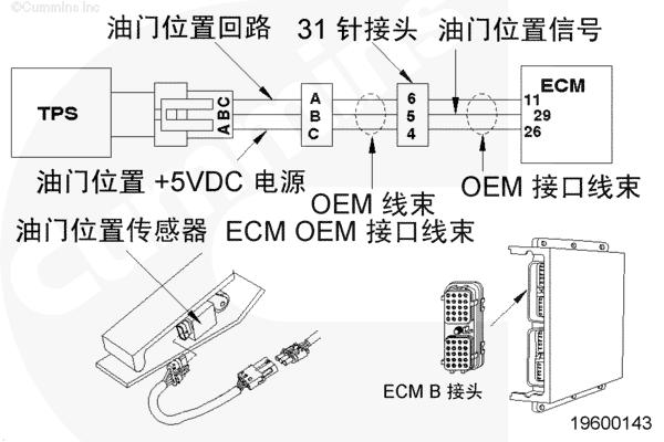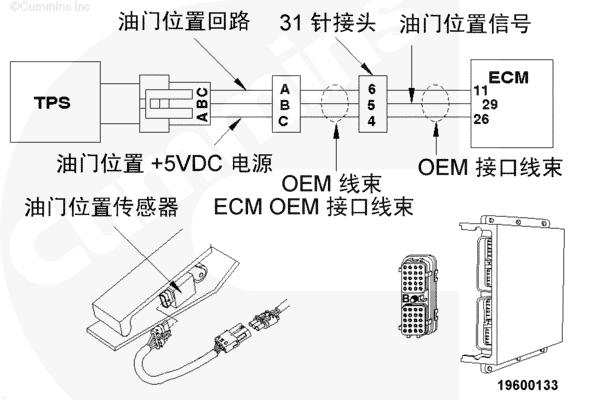 油門踏板通過 OEM 線束和 OEM 接口線束向 CM500 ECM 提供駕駛員油門指令。CM500 ECM 利用此信號來確定燃油油軌執行器閥的供油指令。