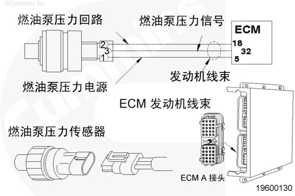 燃油泵壓力傳感器電路圖通過康明斯QSK78發動機線束向 CM500 ECM 提供燃油泵壓力傳感器信號。CM500 ECM 利用燃油泵壓力傳感器信號監測從控制閥體輸送到噴油器正時油腔的燃油泵壓力。