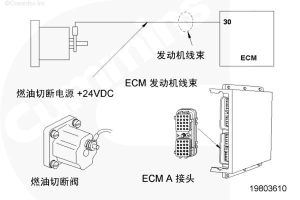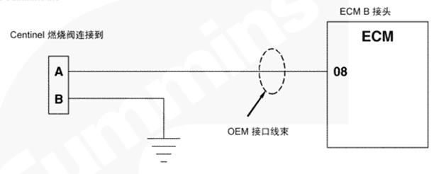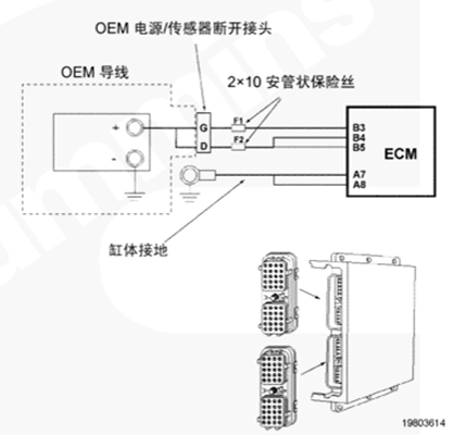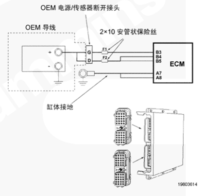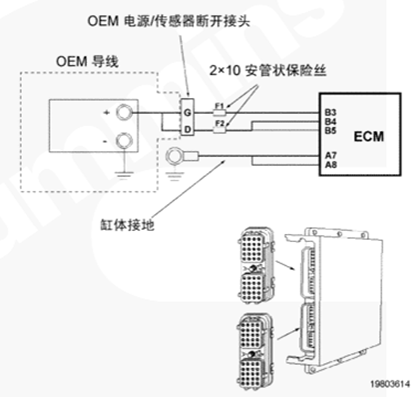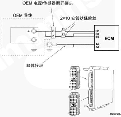 CM500 ECM 通過 OEM 線束和康明斯QSK78發動機線束接收無開關蓄電池電壓。OEM 接口線束的無開關蓄電池導線中有兩個個串聯式 10 安培保險絲,以保護 CM500 ECM。康明斯QSK78發動機線束中的蓄電池回路導線連至康明斯QSK78發動機缸體接地。