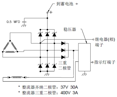 � 交流發電機裝有整體式硅整流器。一個裝在交流發電機內部的晶體管穩壓器,限