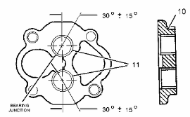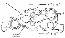 使用工具 (B) ,將套筒軸承 (4) 安裝到泵體 (3) 中。 軸承接頭應距兩個軸承孔中心線 30 ± 15 度。 安裝套筒軸承,使套筒軸承與泵體的外側齊平。
