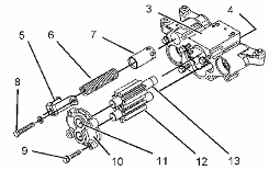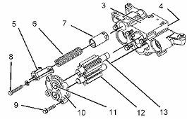 使用清潔的發動機機油潤滑惰齒輪和驅動齒輪。 使用清潔的發動機機油潤滑套筒軸承 (4) 。 將惰齒輪 (12) 和驅動齒輪 (13) 安裝到泵體 (3) 中。