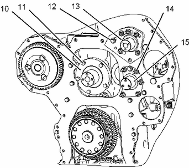 檢查凸輪軸齒輪與可調節惰輪齒輪組件之間的齒隙。 此齒隙應為 0.356 ± 0.254 mm (0.014 ± 0.010 in)。 參考測試和調整, "齒輪總成(前)- 正時",以了解齒隙調整步驟。擰緊螺母 (12) 和螺栓至扭矩為 55 ± 10 N·m (41 ± 7 lb ft)。