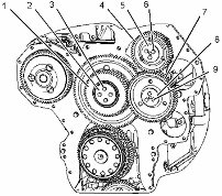 如有必要,調整凸輪軸齒輪和可調節惰輪齒輪的齒隙。 請參閱測試與調整, "齒輪總成(前)- 正時"。