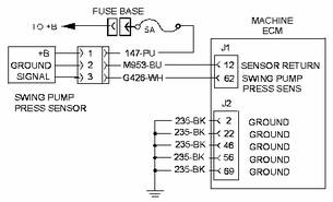 該診斷代碼與回轉泵壓力傳感器有關。 FMI 04 表示機器 ECM 已確定傳感器輸出信號電壓低于正常值。