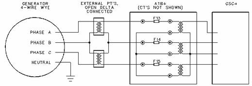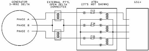 在四線 Y 形發電機上,除非完全持續的平衡掉負載,需要三個獨立的電壓互感器(PT's)來提高功率表的精度。 即使負載已經平衡,仍然不能確定一些 功率參數 GSC+顯示屏上沒有顯示這些參數:有效功率相位 A、B、C 和功率因數相位 A、B、C ATB+包括三個電壓互感器,以適應4 線 Y 形發電機。 當 4 線 Y 形發電機組使用一個開放三角形 PT 配置時,沒有利用ATB+的全部性能。
