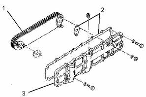 檢查濾芯(1)有無裂紋或其他缺陷。如果濾芯損壞,請更換濾芯。更換所有密封墊(2)并檢查機油冷卻器蓋(3)有無裂紋。如果機油冷卻器蓋損壞,請更換蓋。
