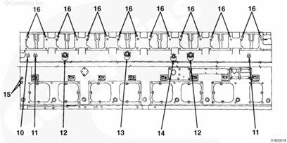 對(duì)缸體進(jìn)行了改動(dòng)以便能夠安裝較長(zhǎng)的缸蓋螺釘。以前的康明斯發(fā)動(dòng)機(jī)必須使用長(zhǎng)度為 171 mm [6.73 in] 的螺釘?,F(xiàn)在的康明斯發(fā)動(dòng)機(jī)必須使用長(zhǎng)度為 203 mm [8.00 in] 的螺釘。短螺釘可用于維修。這些螺釘都是鍍鎘的(銀色或金色)。必須將這些短螺釘擰緊至 353 N•m [260 ft-lb]。如果短螺釘表面具有 lubrite 鍍層,而且顏色是黑色,則必須予以更換。203 mm [8 in] 螺釘只能使用 lubrite 鍍層。555 N•m [409 ft-lb] 扭矩必須施加在這些螺釘上。K50 康明斯發(fā)動(dòng)機(jī)總是使用 203 mm [8.00 in] 螺釘。