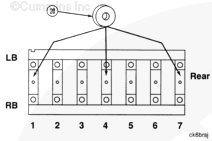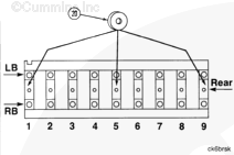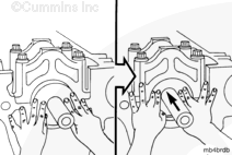 K38 康明斯發(fā)動(dòng)機(jī)上的主軸承蓋編號(hào)到“7”,而 K50 康明斯發(fā)動(dòng)機(jī)上則編號(hào)到“9”。將每個(gè)蓋安裝到正確位置中。“1”號(hào)蓋安裝在缸體前部。蓋中的軸承定位舌槽必須位于缸體中的槽的同一側(cè)。 |