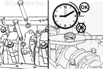 主軸承蓋上標記有“V”字樣。使“V”標記指向發動機的前面。定位不正確會導致發動機嚴重損壞。 |