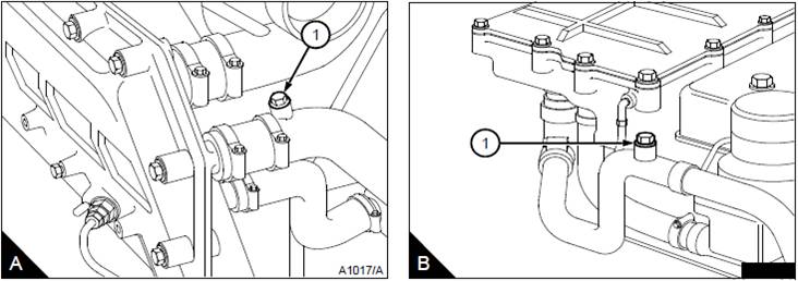 3對(duì)于裝配中冷器的發(fā)動(dòng)機(jī):打開垂直中冷器的放氣螺釘(A1)或水平中冷器的放氣螺釘(B1)。這將確保從中冷器中排出所有冷卻液。