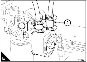 6如果Perkins1000/4/6缸機(jī)油冷卻器安裝在濾清器座上而不是缸體上,那么也必須對(duì)其進(jìn)行排放和沖洗。為此,斷開冷卻器頂部的軟管(E1和E2)并通過出口接頭(E1)沖洗機(jī)油冷卻器直到清水從進(jìn)口(E2)流出。
