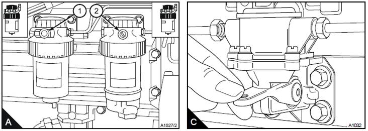 1松開粗濾器(A2)的濾清器座上的放氣旋塞。操作燃油輸油泵(B)的注油桿,直到排出從放氣旋塞進入燃