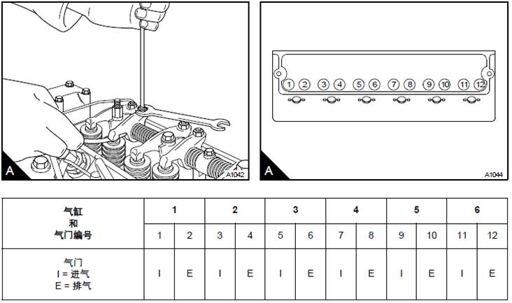 在發動機熱態或冷態下,檢查氣門桿頂端和搖臂(A)之間的間隙。進氣門的正確間隙為0,20mm(0.008