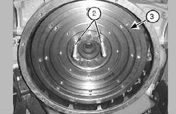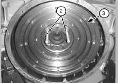 注:飛輪(3)很重。用適當(dāng)?shù)牡跹b設(shè)備,支撐住飛輪(3),再拆下其余的調(diào)整螺釘(1)。