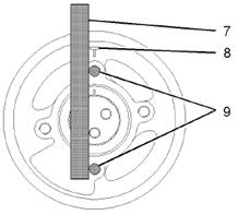 4.用頂部的“T”標記(8)對準皮帶輪,并且與發動機的中心線成一直線,然后在曲軸上安裝皮帶輪。使用一個合適的直尺(7)靠在導向銷(9)上,以協助皮帶輪的校準。