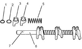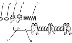 1.清潔所有的部件并且檢查它們。檢查彈性擋圈(1)的凹槽,確保搖臂軸(6)和搖臂(3和4)中的所有油孔沒有堵塞,然后才能開始組裝程序。如有必要,更換任何磨損零部件和任何損壞的零部件。