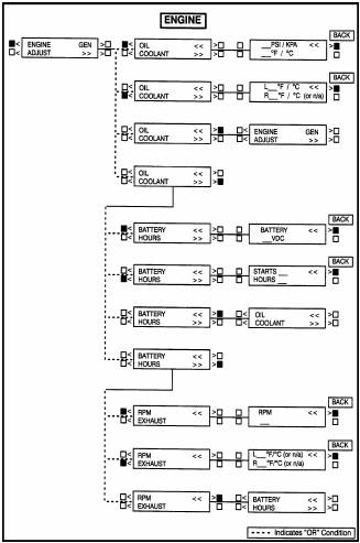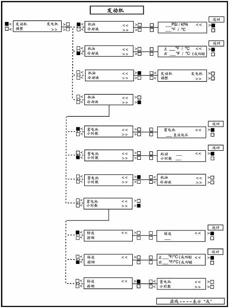 下一頁顯示了主功能和一些子功能的方框圖。如圖所示,主功能可進一步分為四個子功能。如果需要顯示發動機參數,如機油壓力和機油溫度、水溫、發動機轉速(RPM)和排煙溫度等,按顯示屏上“ENGINE”(發動機)附近的按鍵,參考本章“ENGINEMEMU”(發動機功能)。