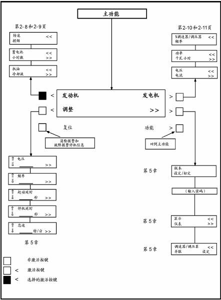 圖2-2給出了數字式顯示屏及其功能選擇鍵,請查閱前頁的“前端面板”關于功能顯示屏和按鍵的說明。當不起動發電機組在備用模式下操作和查看功能顯示屏時,按下然后釋放自我偵測鍵,這將會初始化PCC操作軟件,同時允許操作功能顯示面板,如果30秒內沒有選擇任何功能,軟件定時器將會自動切斷電源。在接電模式下,控制盤一直帶電,顯示屏一直處于工作狀態。