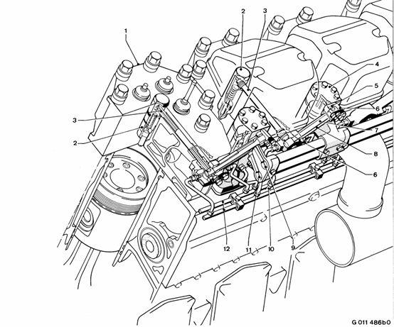挺桿由凸輪驅動,設計有一套筒結構,用以導向頂柱。 頂柱將挺桿的運動傳遞給氣閥搖臂。在搖臂支架上布置有兩個氣閥搖臂,長的氣閥搖臂是排氣側,短的氣閥搖臂是進氣側,搖臂軸定位在缸頭上的兩個搖臂支架上,由開口銷進行定位。在搖臂上的調整螺釘用以調整氣閥間隙,潤滑油通過齒輪箱上的油口進入凸輪軸,搖臂的潤滑油來自于凸輪軸軸承。挺桿由缸頭上的潤滑油來潤滑。
