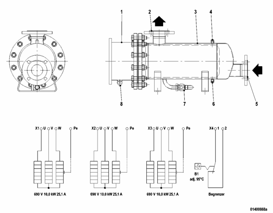 描述:柴油機裝備有二級渦輪增壓系統,渦輪增壓系統由五組增壓機組成,每一組增壓機又分為第一級增壓和第二級增壓,渦輪增壓機組安裝在機身上方的排氣管處,其是否投運取決于柴油機的功率。渦輪機安裝在冷卻水室和排氣管上方,該冷卻水室用以保證渦輪機軸承的冷卻。將渦輪機安裝在排氣管的正上方是為了降低熱損耗,并且可以保證機身外側的溫度達到相應的標準。