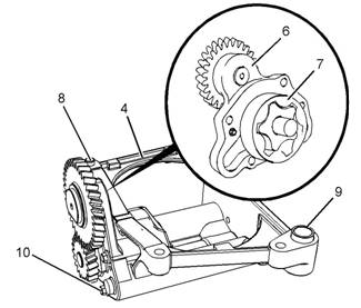 4如有 必要, 從發(fā) 動機機 油泵 的前 蓋組件 (6) 上 卸下螺 栓 (10)。 從 發(fā)動 機機 油泵 (4) 上卸 下前蓋組件 (6)。