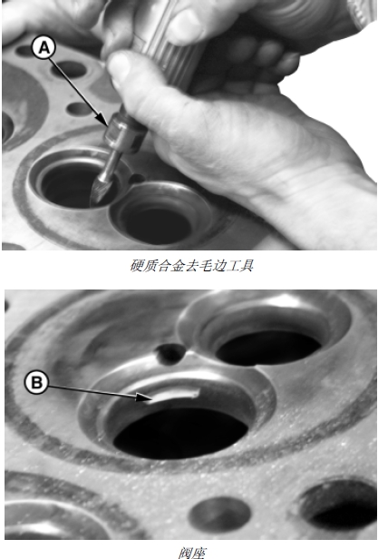 1. 用硬質合金去毛邊工具 (A) 提起閥門座鑲圈底部的毛邊 (B)。