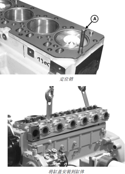 重要提示: 如果缸蓋在缸體上,調(diào)整缸蓋位置時(shí)會(huì)損壞缸墊。應(yīng)通過安裝和使用定位銷 (A) 將缸蓋定位在缸體上。