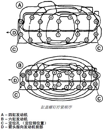 3. 擰緊所有帶帽螺釘(按上面所示位置)直到套筒扳手上的第二個(gè)標(biāo)記 (B) 與缸蓋上的標(biāo)記 (C) 對(duì)齊為止。