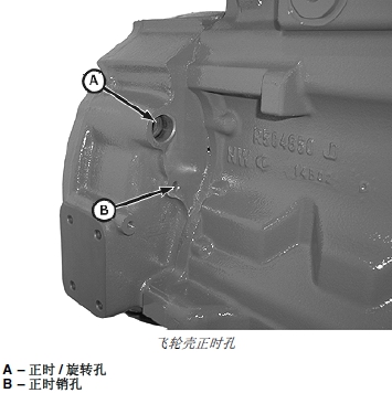 2. 拆下John Deere約翰迪爾強鹿柴油發動機正時/ 旋轉孔 (A) 和正時銷孔 (B) 上的塑料塞或蓋板。