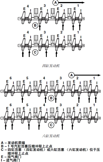 3. 將曲軸旋轉(zhuǎn) 360°。將 6 號汽缸活塞鎖定在壓縮沖程上止點 (C)。