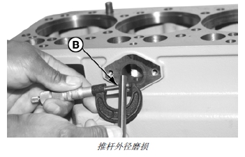 2. 測量推桿外徑 (B)。如果推桿外徑小于技術規格,應安裝新推桿。