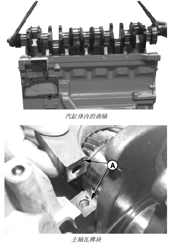 3. 安裝主軸瓦蓋,確保軸瓦蓋和汽缸體上的軸瓦榫塊(A) 位于汽缸體的同一側。