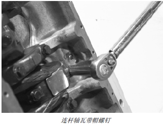 8. 安裝連桿軸瓦蓋和連桿軸瓦。安裝新帶帽螺釘并按照技術規格將其擰緊。(參見第 030 章“安裝活塞和連桿總成”部分。)