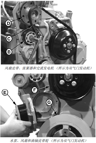 注意: 拆卸正時齒輪蓋時,不需要拆下皮帶張緊器(雙氣門John Deere約翰迪爾強鹿柴油發動機和一些四氣門John Deere約翰迪爾強鹿柴油發動機)、水泵皮帶輪或水泵。