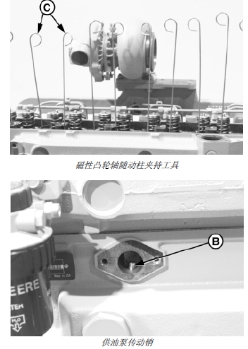 7. 維修臺上的John Deere約翰迪爾強鹿柴油發動機要轉一定角度,使凸輪軸隨動柱和供油泵制動銷 (B) 沿凸輪軸凸輪緣脫離。