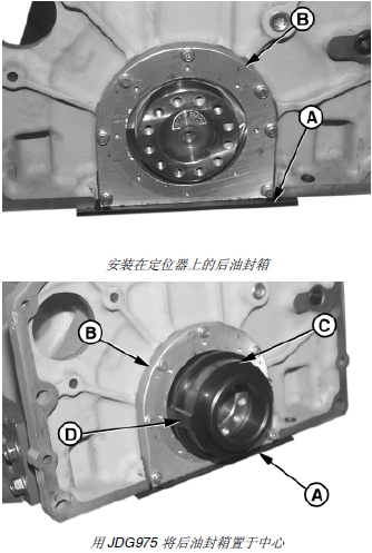 3. 將 JDG975 正時齒輪室蓋/ 后油封箱定位器 (C) 較大的一端安裝曲軸后凸緣上,錐形定位器 (D) 應位于時鐘 3 點和 9 點的位置。