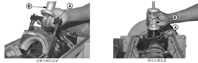 3. 使用 JDG996 主軸瓦蓋拉拔器/ 安裝器 (A) 和滑錘(B),按照對應的順序對齊凹槽和定位片,以安裝軸瓦蓋和軸瓦。一定要在擰緊帶帽螺釘前將軸瓦定位片對準正確的位置。