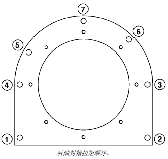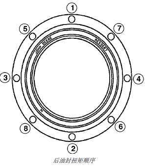注意: 為了與曲軸箱對準,在安裝后油封箱前先應從油盤襯墊底部清潔所有的墊圈材料和密封劑。曲軸凸緣的外徑和后油封箱的內徑一定不可有刻痕和毛刺。用砂布修復磨損表面,并將表面徹底清潔干凈。