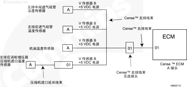 電子控制模塊 (ECM) 通過 CENSE™ ECM A 接頭上的觸針 01 向 CENSE™ 線束上的傳感器提供 +5 VDC 供電。當一個大于 5 VDC 的電壓源短接到該電路時,所有連接到該傳感器的電源都會發生多個故障。發生這種情況是因為所有連接到該電源的部件信號電路電壓將上升到高于該部件的超出正常范圍(高壓短路)閾值。