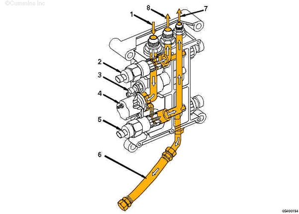 1. 燃油泵側(cè)燃油進口 2. 燃油正時執(zhí)行器 3. 燃油溫度傳感器 4. 燃油切斷閥 5. 燃油油軌執(zhí)行器 6. 燃油油軌阻尼管 7. 燃油到燃油油軌 8. 燃油到燃油正時。 | |||