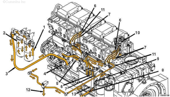 1. 油箱側(cè)燃油進口 2. 帶水分離器的燃油濾清器 3. 燃油泵進口管 4. 燃油泵 5. 燃油控制閥供油管 6. 燃油正時供油管 7. 燃油油軌供油管 8. 燃油油軌阻尼管 9. 電子燃油控制閥總成 10. 噴油器 11. 燃油回油管 12. 燃油回油(發(fā)動機到油箱) 13. ECM。