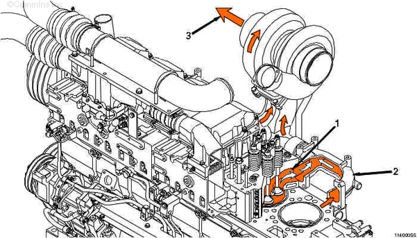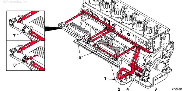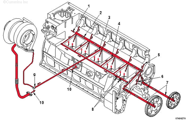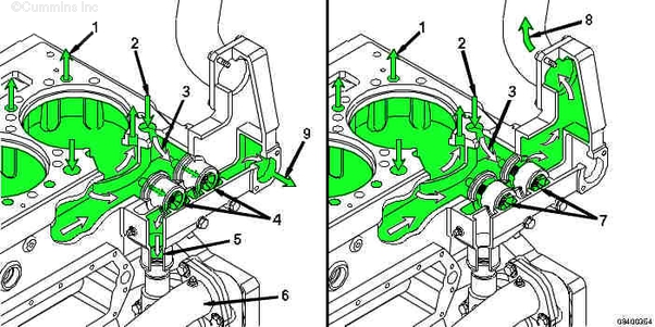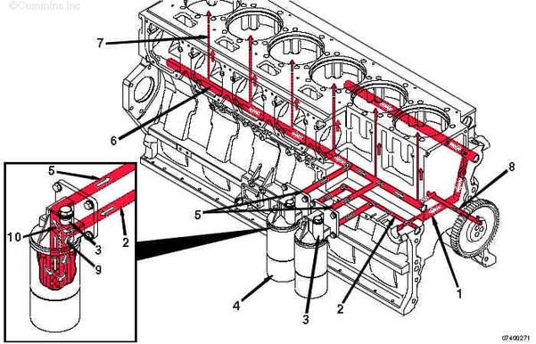 1. 來自濾清器的機油流 2. 主油道 3. 至渦輪增壓器供油管的油道 4. 至活塞冷卻噴嘴油道的油道 5. 至凸輪軸襯套和缸蓋的機油 6. 至主軸承和曲軸的機油 7. 至前惰輪的機油 8. 至活塞冷卻噴嘴的機油 9. 渦輪增壓器供油管 10. 渦輪增壓器機油流回曲軸箱。
