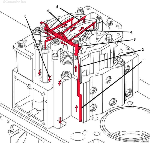 1. 流過缸蓋的機油 2. 流過搖臂室殼體的機油 3. 流經(jīng)搖臂軸螺栓周圍和通過搖臂軸的機油 4. 流過搖臂的機油 5. 流過噴油器搖臂的機油 6. 機油流回油底殼。 | ||||||