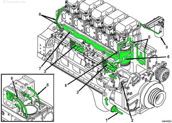 1. 來自散熱器的冷卻液進口 2. 水泵 3. 流過機油冷卻器的冷卻液 4. 流經(jīng)缸套周圍的冷卻液 5. 至缸蓋的冷卻液 6. 從缸蓋至冷卻液歧管的冷卻液 7. 冷卻液歧管至節(jié)溫器殼體 8. 冷卻液濾清器供油和回流管 9. 冷卻液濾清器。