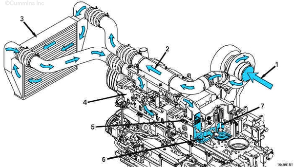 1. 至渦輪增壓器的進氣口 2. 渦輪增壓后的空氣至空-中冷器 3. 空-空中冷器 4. 進氣歧管 5. 格柵加熱器(僅限于工業(yè)用) 6. 缸蓋進氣口 7. 進氣門。 | ||