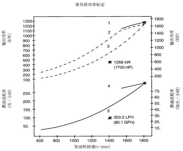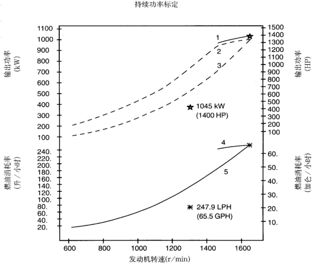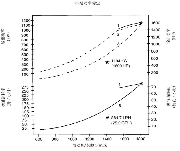標定條件:功率標定是基于ISO8665標準規定的條件:大氣壓力為100kPa (29.612英寸汞柱),環境溫度為25℃(77°F),相對濕度為30%。螺旋槳軸功率為按97%扣除齒輪箱損失后的凈功率。燃油消耗是基于使用比重為838.9g/l(7.001磅/加侖),LHV為42780kJ/kW(18390Btu/lb)的35°API燃油。 1. 制動功率 kW(HP) 4. 軸功率對應的燃油消耗 2. 扣除齒輪箱損失后的軸功率 kW(HP) 5. 螺旋槳推進曲線對應的燃油消耗 3. 螺旋槳推進曲線 持續功率:這種功率標定的康明斯發動機允許在全負荷工況下連續不斷地使用。這種功率為ISO3046標準功率 * 對非LTA康明斯發動機,其燃油耗高1-3%。 | ||||||