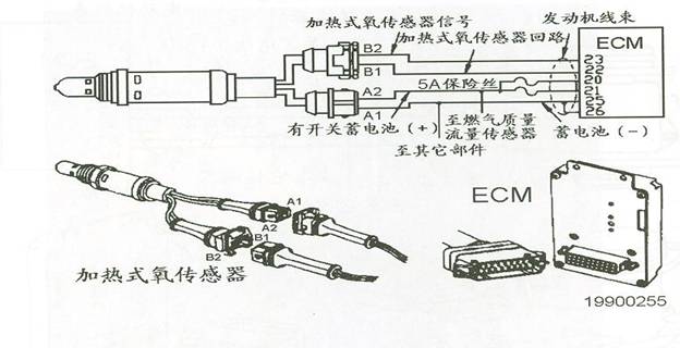 氧傳感器用來檢測發動機廢氣中氧含量,并發信號給ECU(M)。電子控制模塊(ECU(M))通過HOS來計算發動機運行時的實際空燃比,并根據運算結果來調整燃料的供給,從而獲得最佳的排放水平