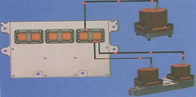 ECU(M)通過輸入設備輸入的參數,通過內部程序的計算,向各輸出設備輸出控制指令,由于電控柴油系統的多樣性,各種不同的電控燃油系統,其所具有的執行元件各不相同,以系統最主要的輸出設備,實現噴油量和噴油正時控制的執行元件為例。中馬力共軌系統通過噴油器來直接實現對噴油量和噴油正時的控制,而有些燃油系統通過單個電磁閥實現所有六個缸的控制。