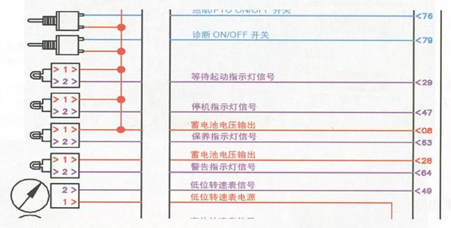 指示燈是ECU(M)向操作者輸出信號的輸出設備。這些指示信號包括故障信號、停機警告燈、等待啟動信號和保養提醒信號等等,不同的機型指示燈的設置有所不同,下圖所示為ISBe發動機指示燈的電路圖